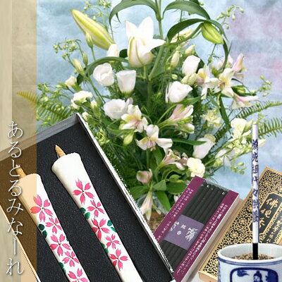 【お花の宅配:翌日配達】京都の老舗香・蝋燭店とコラボ!送料無料!京都老舗のお線香と手描き和蝋燭とお供え用アレンジメントセット (バスケット・アレンジ)春
