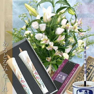 【商品内容説明】季節のお花・小花・グリーン・かご・京都老舗佛現香(灰が倒れず、文字が浮き出てきます。)・京都手描き絵蝋燭2本組み送料無料!当社専属デザイナーによるお供え用の季節のお花のアレンジメントと京都老舗香・ロウソク専門店より高級線香と、雅なロウソクをお取り寄せしました。季節により、お花の種類が変わることがございます。ご了承ください。お色目は、白仕上げ・淡色仕上げ・明るい色仕上げからお選びください。※画像は、イメージ画像です。【商品内容説明】季節のお花・小花・グリーン・かご・佛現香・織りあかり北海道、沖縄は、別途500円いただきます。ご了承ください。【用途】お供え お葬式 法事 お墓参り